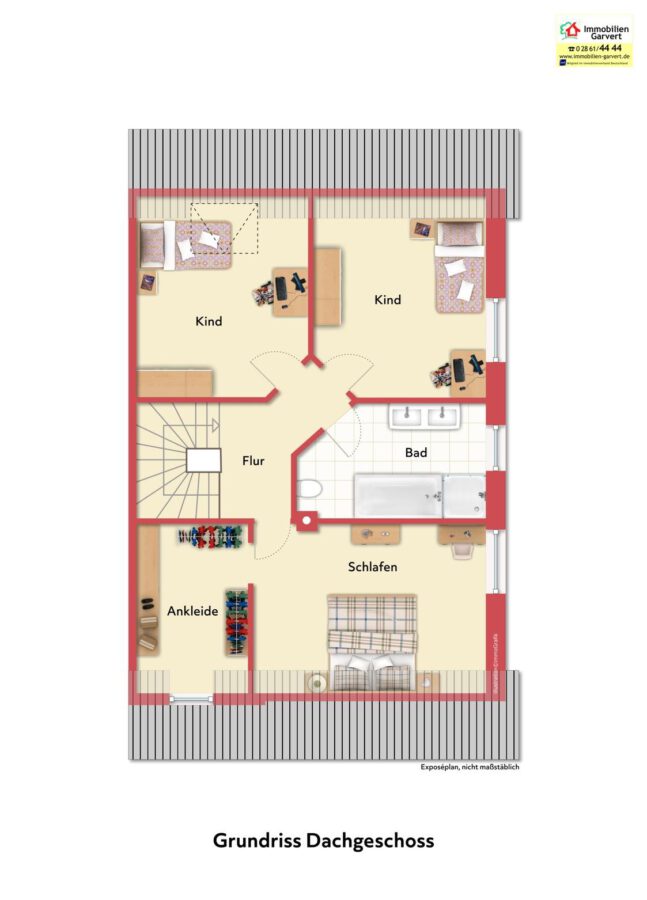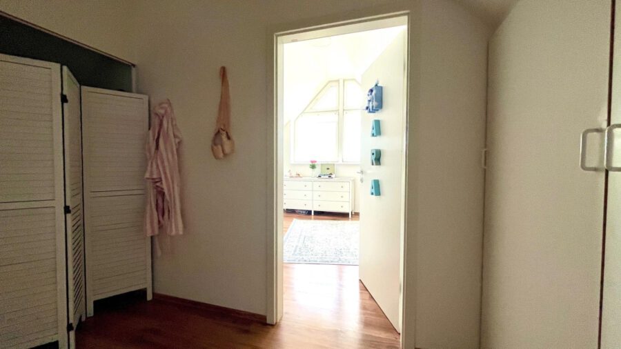 Das Dachgeschoss beherbergt drei geräumige Schlafzimmer sowie ein komfortables Vollbad und bietet ausreichend Platz für die ganze Familie. Die warmen Holzdielen verleihen den Räumen eine behagliche Atmosphäre. Der wohnlich ausgebaute Spitzboden beherbergt neben einem großen Raum, zwei kleine Abstellräume, sowie die Gastherme. Die Vollholztreppe verbindet die Etagen auf elegante Weise.