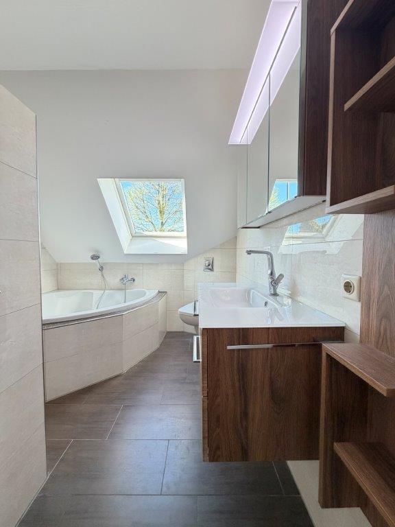 Über eine massive Holztreppe gelangen Sie in das Dachgeschoss, wo sich drei gut geschnittene Schlafzimmer befinden. Das stilvolle Badezimmer überzeugt mit moderner Ausstattung, einer großen Badewanne sowie einer ebenerdigen Dusche.