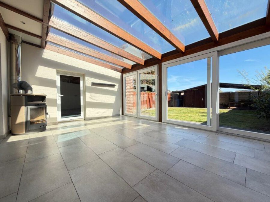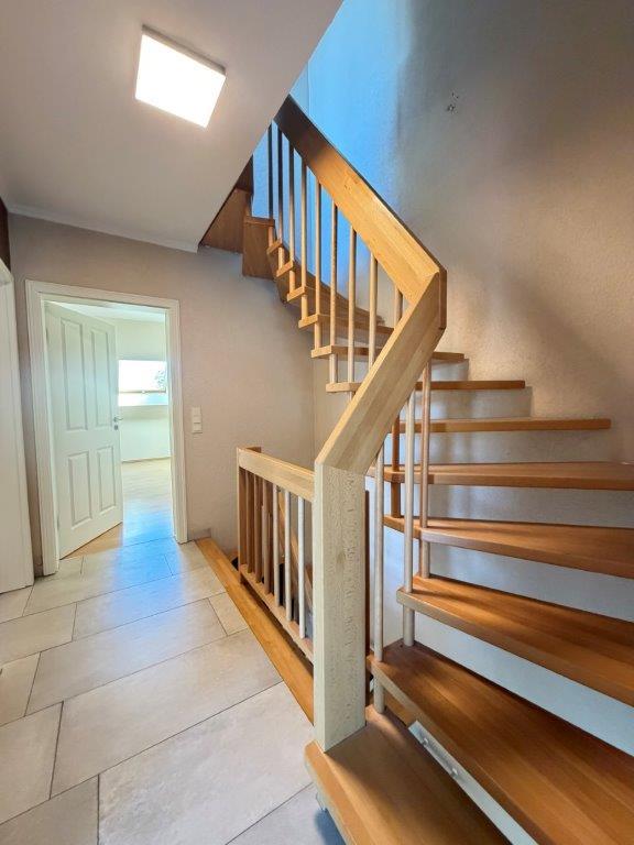Bereits beim Betreten des Hauses empfängt Sie ein einladender Garderobenbereich sowie ein praktisches Gäste-WC. Das Erdgeschoss besticht durch einen großzügigen Wohn- und Essbereich mit direktem Zugang zum lichtdurchfluteten Wintergarten, der den Wohnraum auf angenehme Weise erweitert. Die moderne Küche, die im Jahr 2022 erneuert wurde, fügt sich harmonisch in das Gesamtbild ein. Das gesamte Erdgeschoss ist mit pflegeleichten Fliesen ausgestattet.