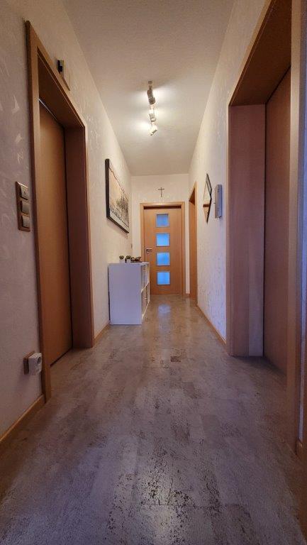 Zur Obergeschosswohnung gehört ein Zimmer, das vor der Wohnungstür liegt und von der Galerie des Treppenhauses aus zugänglich ist. Hinter der Wohnungstür befinden sich an einem Flur zwei Schlafzimmer, ein modernes Bad sowie eine Wohnküche mit Zugang zu einem langen Balkon. Die Räumlichkeiten sind hell gestaltet, die Fußböden auf der gesamten Ebene mit Kork ausgelegt, Bad und Küche mit Fliesen.