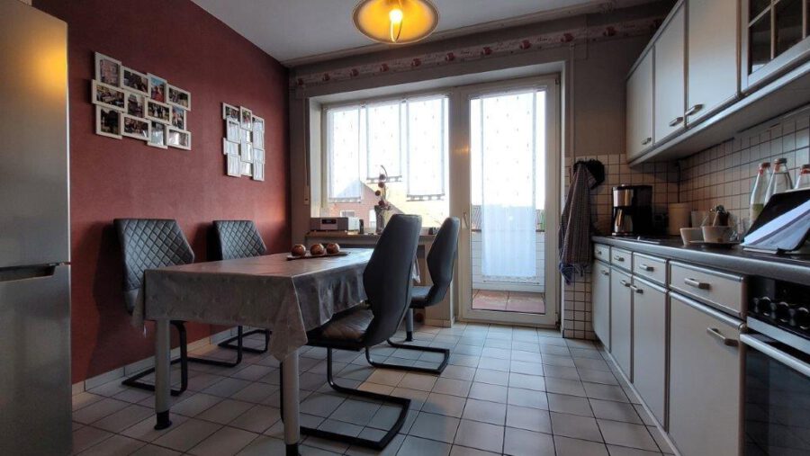 80er Jahre Charme prägt insbesondere die Wohnung im Erdgeschoss: Wohnungstür mit Rundbogen und Steinumrandung, dunkle Innentüren, geflieste Fußböden in Brauntönen. Die Wohnung beherbergt entlang des Flures ein Wohnzimmer, ein vor wenigen Jahren neu ausgestattetes Bad mit ebenerdiger Dusche, einen Abstellraum, die große Wohnküche und angrenzend ein Schlafzimmer. Die Küche bietet Zugang zu Terrasse und Garten. Die Terrasse mit gemauerten Seitenwänden, Fenstern, Tür und Kunststoffüberdachung hat Wintergartenflair. Ein Fensterbereich ist offen für Frischluft und Gartenblick. Hier sitzt man auch bei Regenwetter geschützt. Der schön angelegte und rundum eingefriedete Südgarten bietet im Sommer Sonnen- und Schattenplätze.