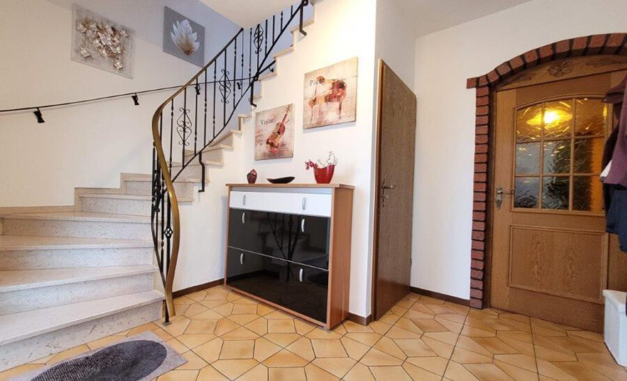 Über das wohnliche, helle Treppenhaus mit Marmorstufen sind die beiden Wohnungen und das Dachgeschoss erreichbar. Die geräumigen Flächen vor den Wohnungstüren in Erd- und Ober- Dachgeschoss bieten Platz für Garderoben.